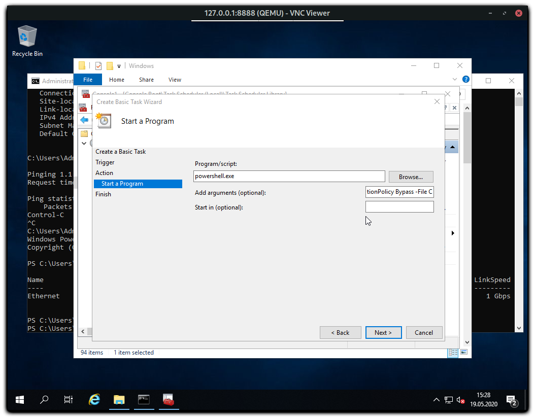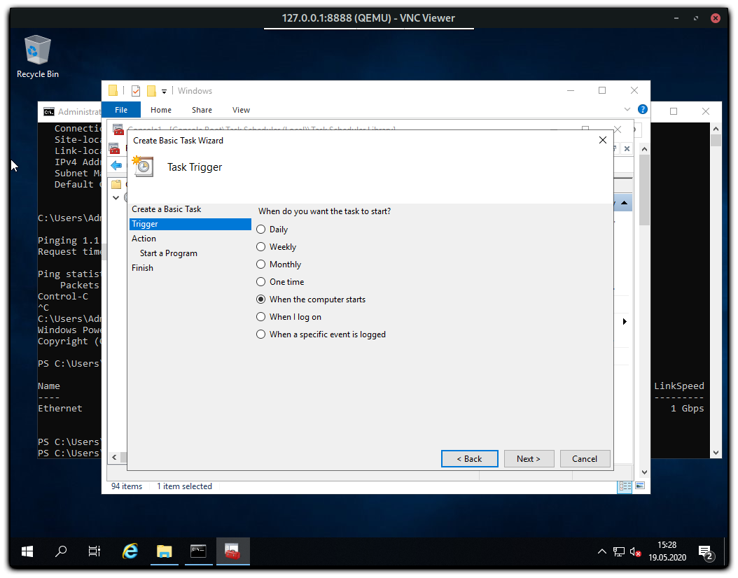 Damit wenn der Server von der Windows installation Bootet auch die richtige Netzwerkkonfiguration bekommt, muss ein Scheduled Task angelegt werden der das folgende PowerShell Script ausführt.
